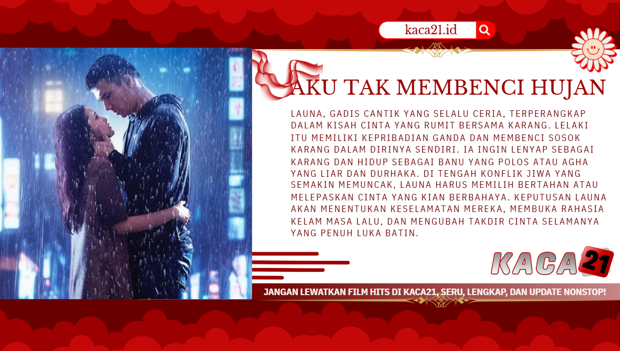 LAYARKACA21 menjadi pintu masuk yang tepat untuk membahas film Aku Tak Membenci Hujan, sebuah drama romantis psikologis yang menyelami cinta, trauma, dan pertarungan identitas dalam diri manusia. Film ini mengisahkan Launa, gadis ceria dengan empati besar, yang jatuh cinta pada Karang seorang lelaki dengan kepribadian ganda dan konflik batin berbahaya. Dari awal, penonton disuguhkan romansa hangat yang perlahan berubah menjadi perjalanan emosional penuh ketegangan dan dilema.